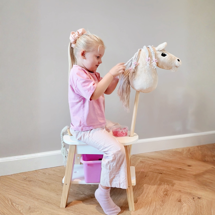Under skamlen finder du en praktisk hylde, perfekt til opbevaring af fx. byASTRUP®´s strigletaske og striglesæt. Dette gør det nemt for børn at have alt deres tilbehør ved hånden, når de begynder at style deres Hobbyhestes manker.