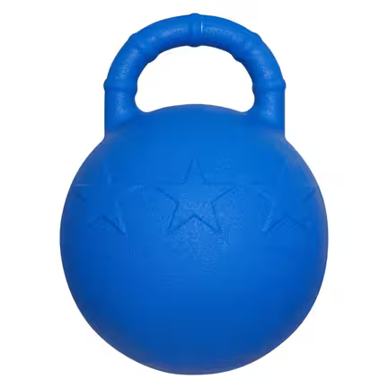 Bolden har håndtag, så den nemt kan hænges op eller som hesten kan bruge til at bide i.