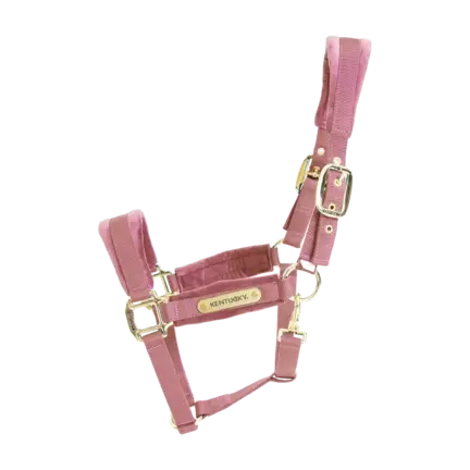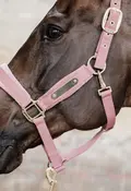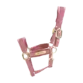 Grimen er fremstillet af robust nylon for din hests sikkerhed og er polstret med fløjl på snude, kinder og krone for ekstra komfort. Den er fastgjort med en karabinhage i guldmessing og har justerbare beslag på begge sider af kronestykket for optimal pasform.