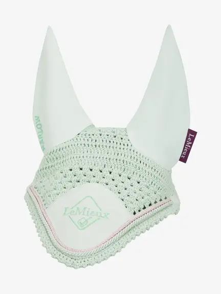 Hutten har håndlavet hækling i farven Softmint med Sugar Pink detaljer, og beskytter din pony mod støv, fluer og insekter.