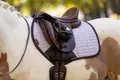 Underlaget har en blød, men holdbar yderdel i suede stof og åndbart mesh foer, der transporterer sved og fugt væk fra ponyens pels.