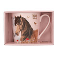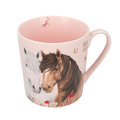Kruset er i flot rosa med et yndigt motiv af to heste omgivet af engblomster