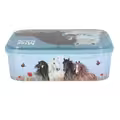 Madkassen er i flot himmelblå farve med fine hestemotiver på en smuk valmueeng.