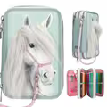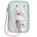Et virkelig flot, trefløjet penalhus i yndig turkisgrøn med den smukke hest Miss Melody applikeret på forsiden. Hesten har en lang og blød man samt grime, som med en karabinhage er forbundet med et aftageligt træktov, der er påsat den ene lynlås.