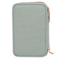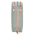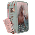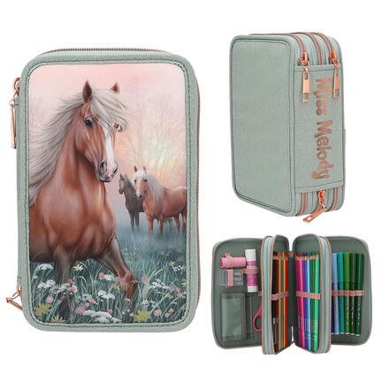 Trefløjet penalhus fra Miss Melody i smuk salviegrøn med et romantisk motiv af tre heste på en eng i diset morgensol.- perfekt til alle hestepiger.